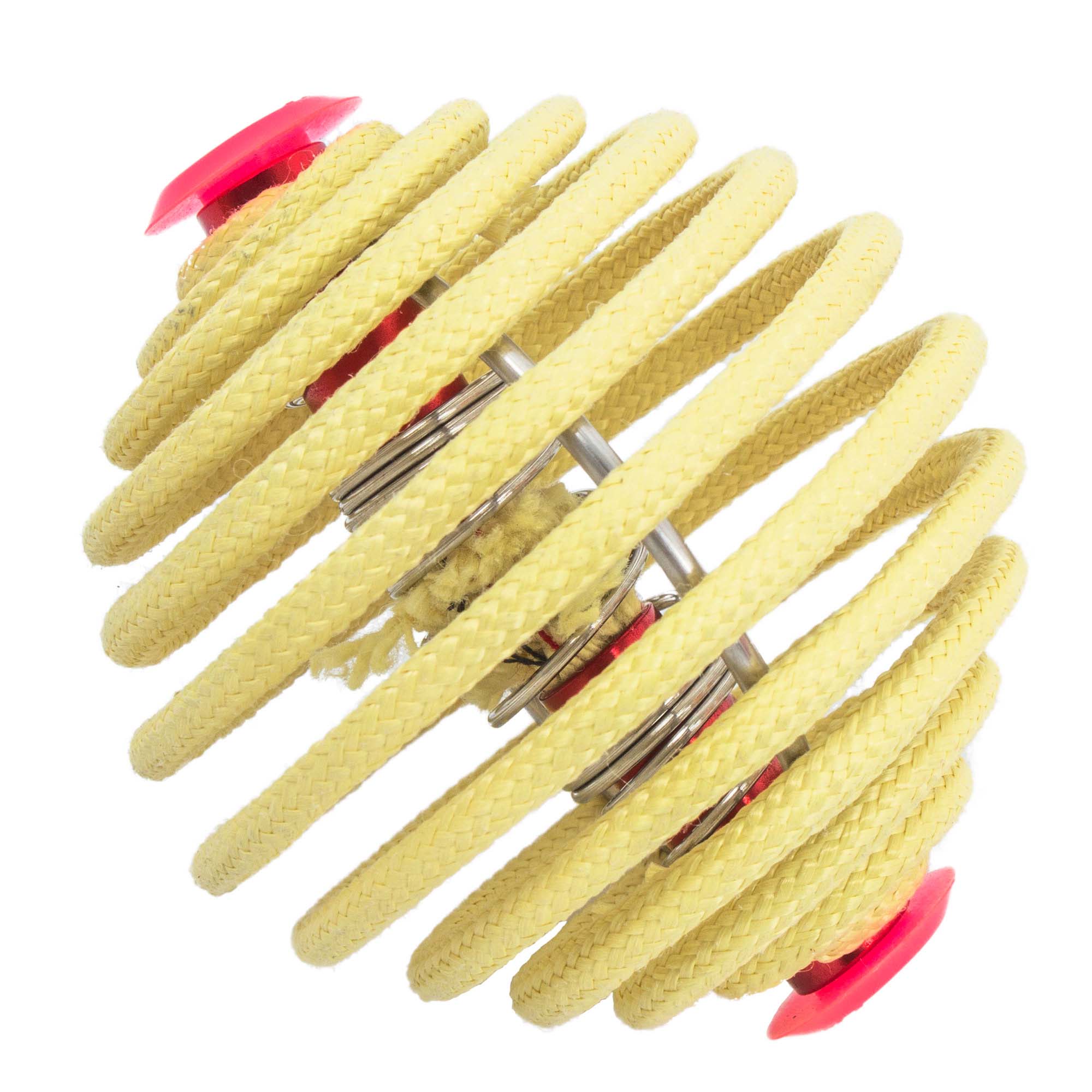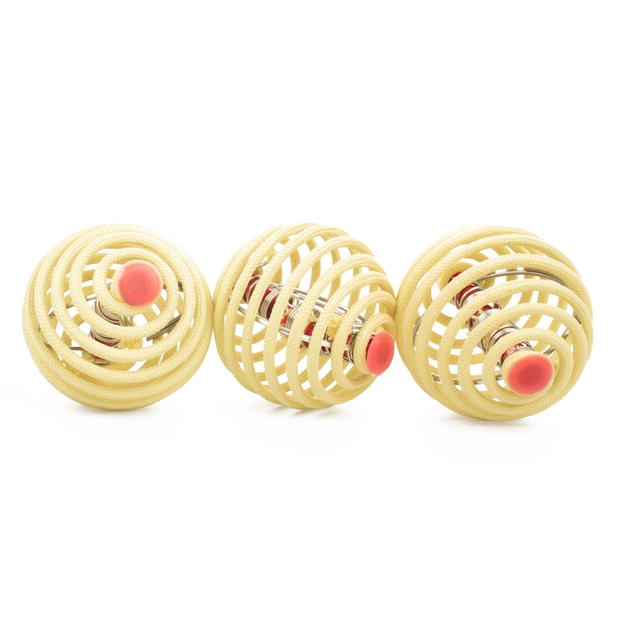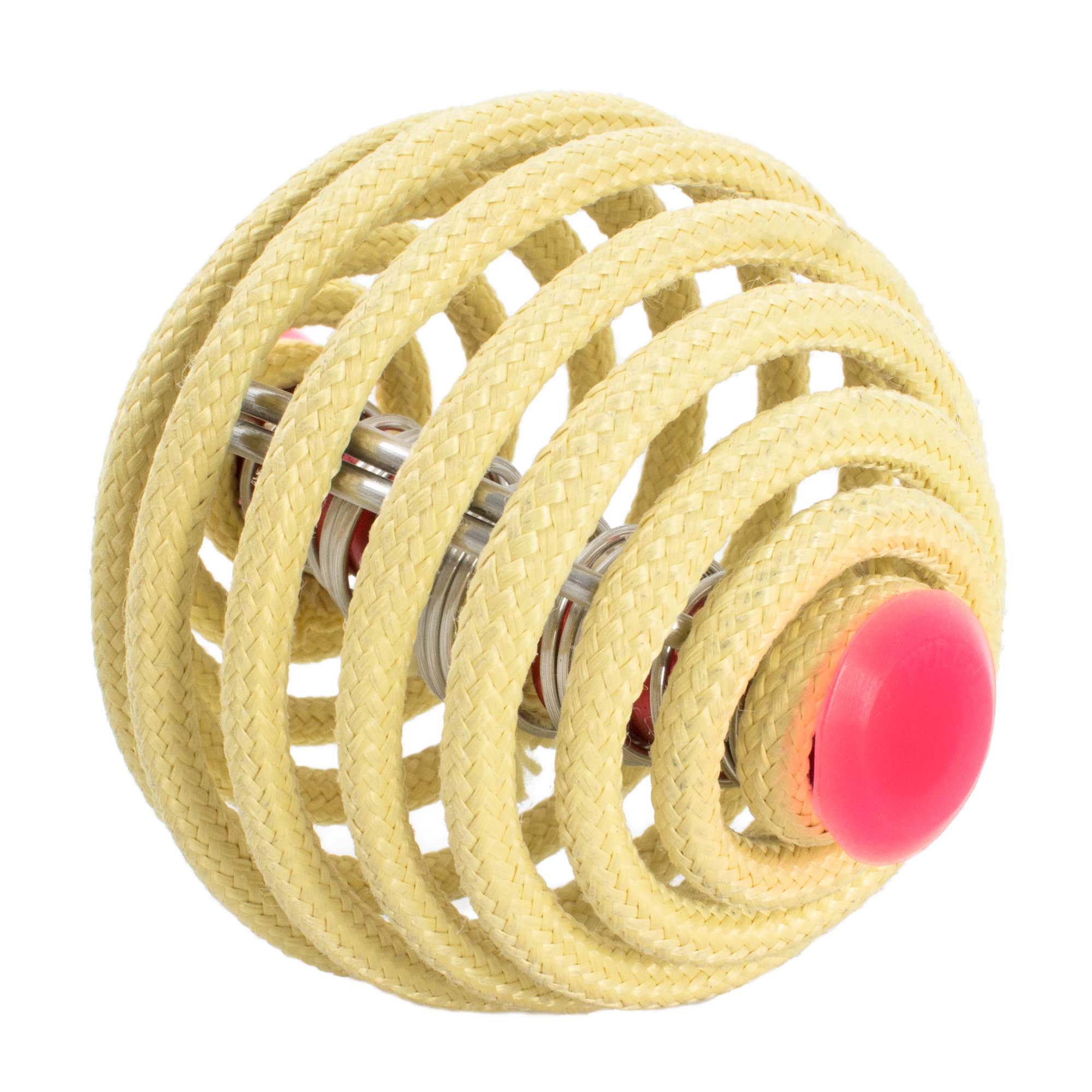 A spiral, fire proof cage surrounds the central wick and fuel reservoir. The cage ensures the flames stay at least one inch above your hands (provided you only hold the fire balls from below), allowing you to juggle fire with your bare hands.